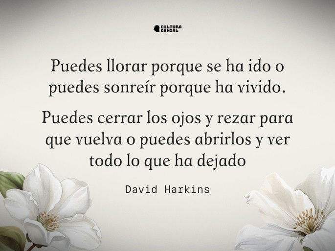 Puedes llorar porque se ha ido o puedes sonreír porque ha vivido. Puedes cerrar los ojos y rezar para que vuelva o puedes abrirlos y ver todo lo que ha dejado. Tu corazón puede estar vacío porque no lo puedes ver o puede estar lleno del amor que compartieron.